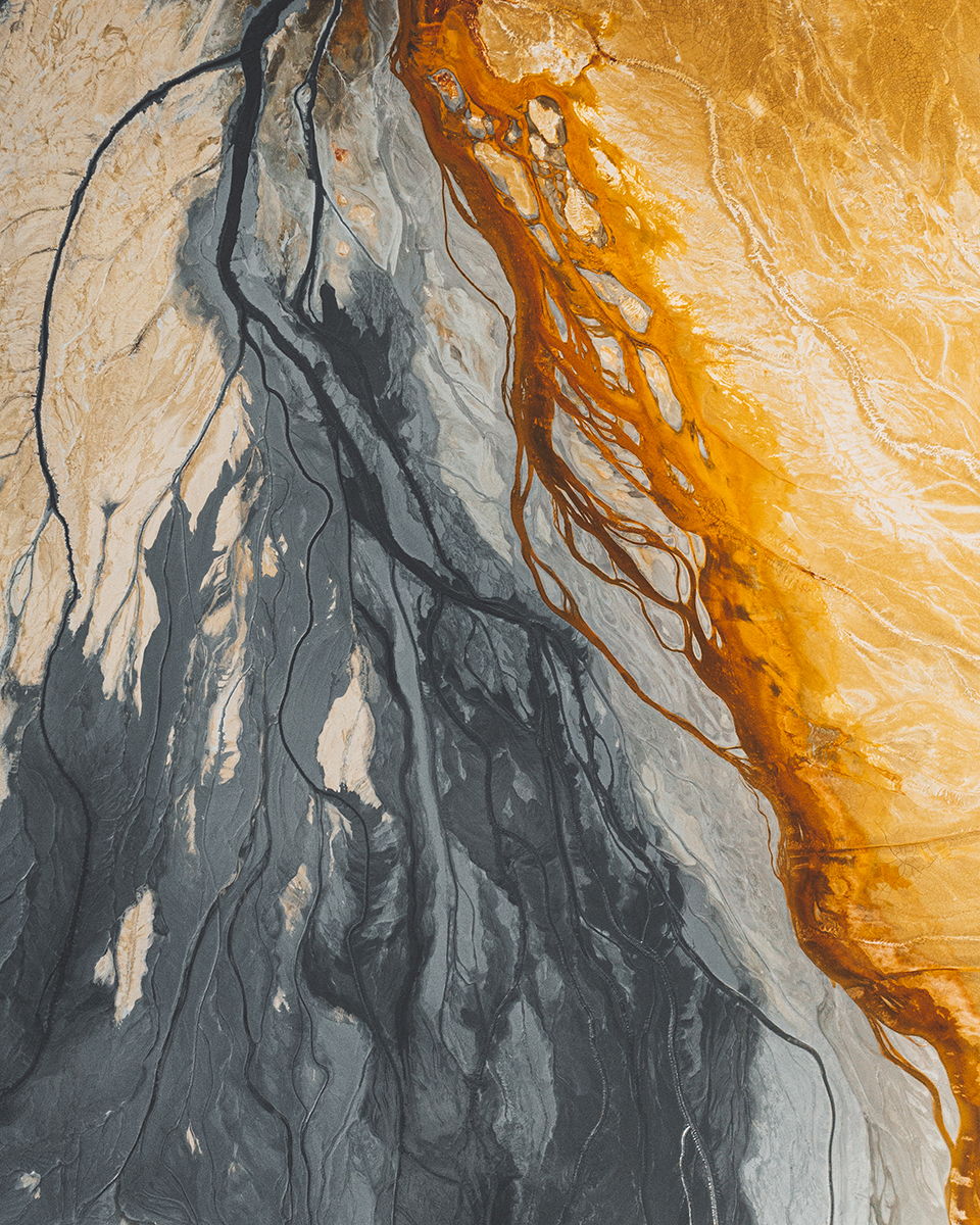 This isn't an abstract painting; it's the Minas de Rio Tinto in Spain seen from directly above. I call this image 'Fire & Ice' because of the violent clash between the vivid orange runoff from decades of copper mining and the cold grey earth surrounding it. I used the top-down drone perspective to flatten the landscape into pure texture and color. It’s a disturbing yet mesmerizing look at how industrial scars can create unintentional, almost alien palettes.