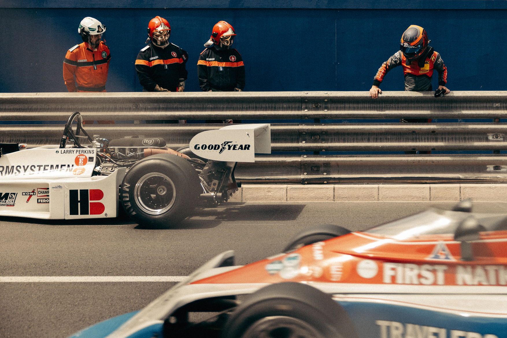 Beyond the glamour of Monte Carlo lies the brutal reality of the Targa-like street circuit. This composition juxtaposes the stillness of a failed engine with the high-speed blur of the passing pack. The driver, helmet still on, looks on with a mixture of adrenaline and defeat, while the track marshals stand ready—a study in the collective labor and individual frustration that defines historic motorsport.