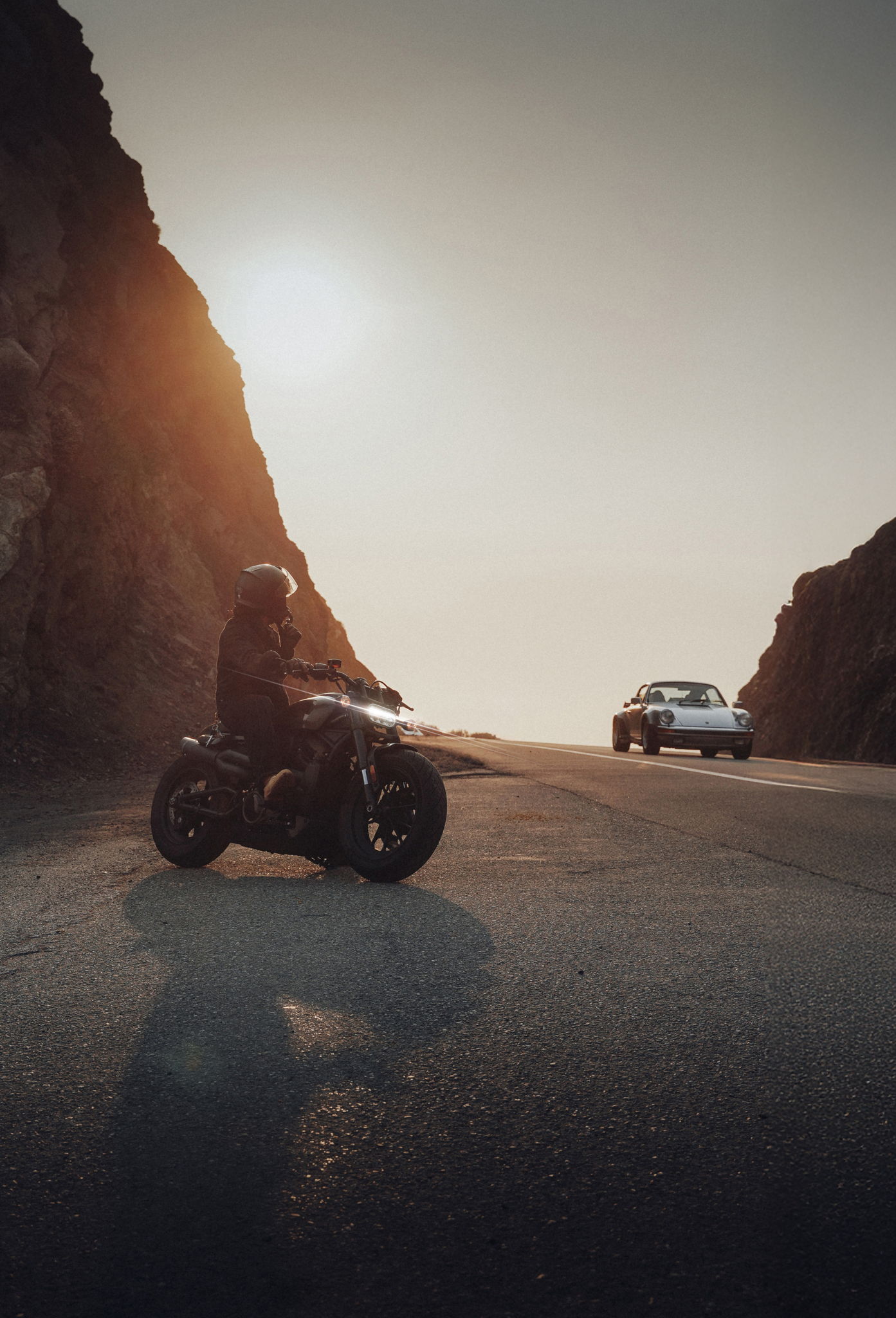 A motorcycle rider admiring a classic Porsche 911 in Malibu, CA.