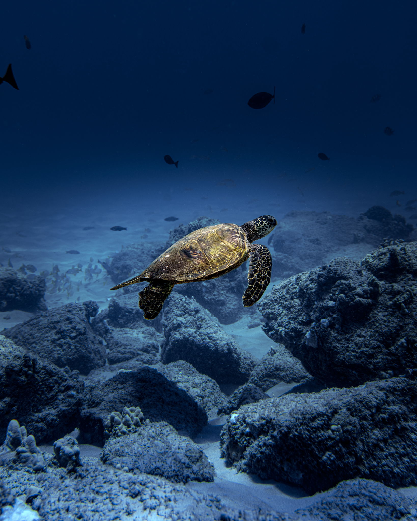 A green sea turtle moves through a volcanic reef in Hawai‘i, navigating open water and structure with ease. The image reflects quiet movement and endurance within a dynamic marine environment, emphasizing passage rather than encounter.
