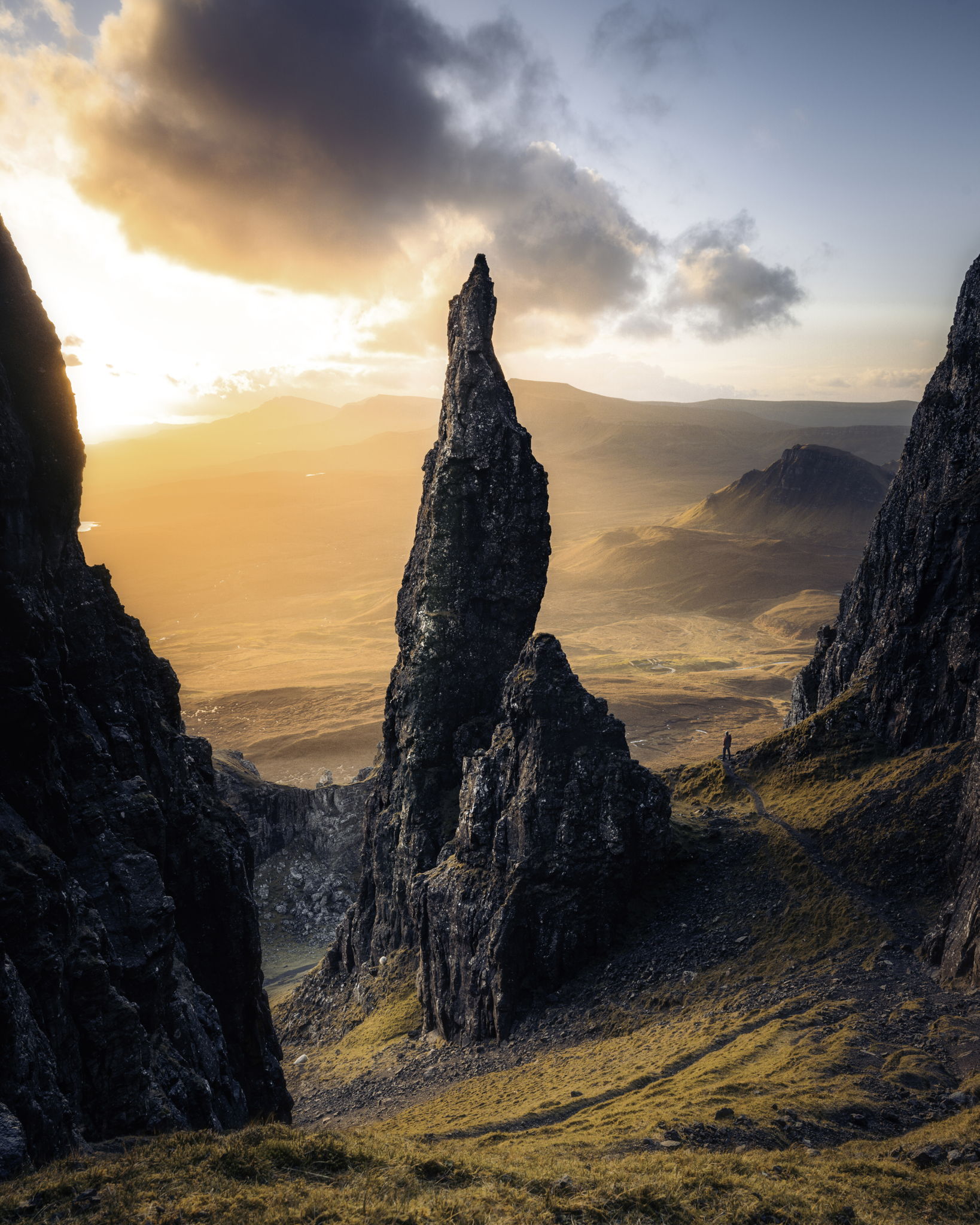 A sunrise for the memory book. Started hiking the Quiraing in the dark, only to discover mostly overcast skies when the twilight appeared. I mistakenly walked a mile past my destination and had to backtrack through the mud and muck of winter in Skye to find the trail. After a tough hike up the hill, I found my composition and whipped out the ND grad filter just in case. The fast moving weather cleared around sunrise, revealing this magnificent cinematic light