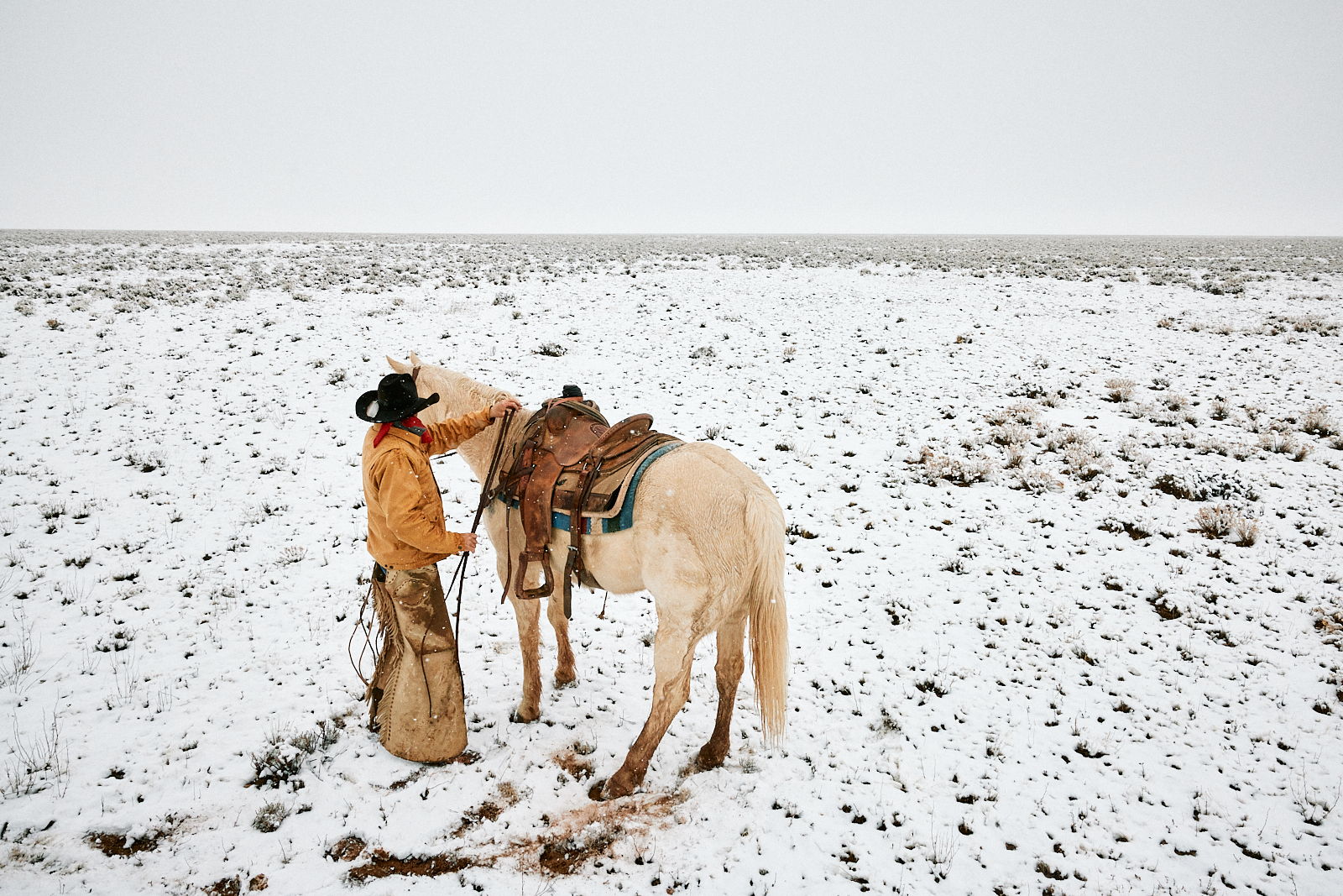 Although you can't see the subjects face and his back is turned to you I really like this image. The snowstorm has enveloped the landscape creating a snowglobe type effect, everywhere you look its the same. The only reference point is the scuffed up ground from where the horse has moved, the cowboy getting ready to mount his horse and head into the vastness.