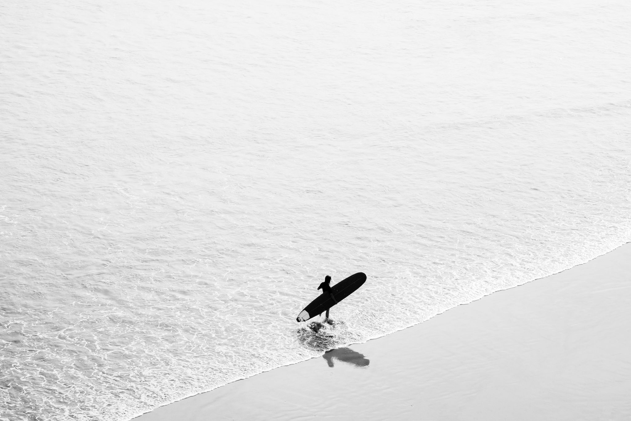 A woman walks across the beach in Imsouane, Morocco with her surfboard.