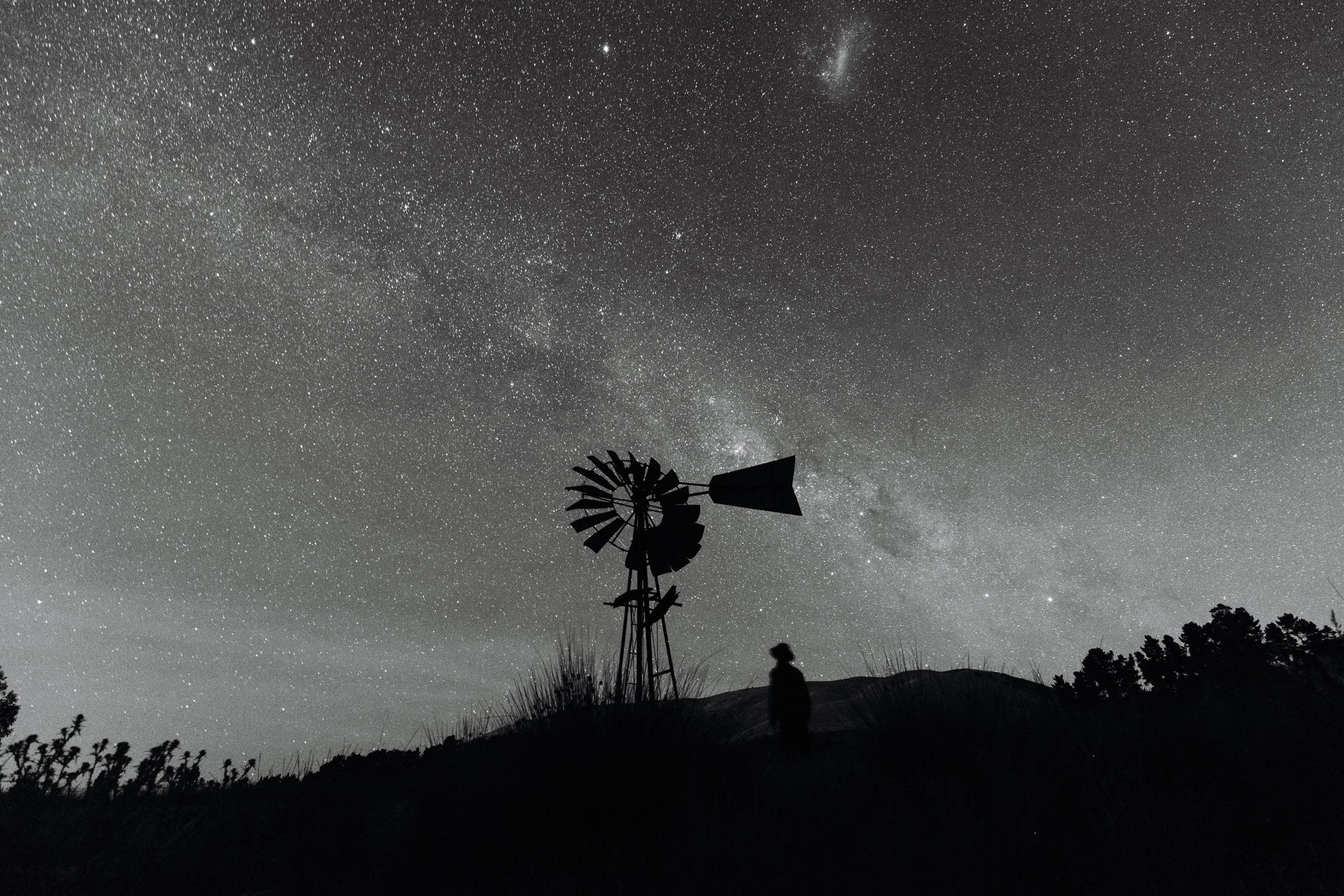 Under a sky filled with stars, a lone windmill stands against the Milky Way while a solitary figure watches in silence. Captured in the quiet darkness of rural New Zealand, the scene blends human presence, landscape and cosmos. The stillness of the moment contrasts with the vast movement of the universe above, evoking both isolation and wonder.